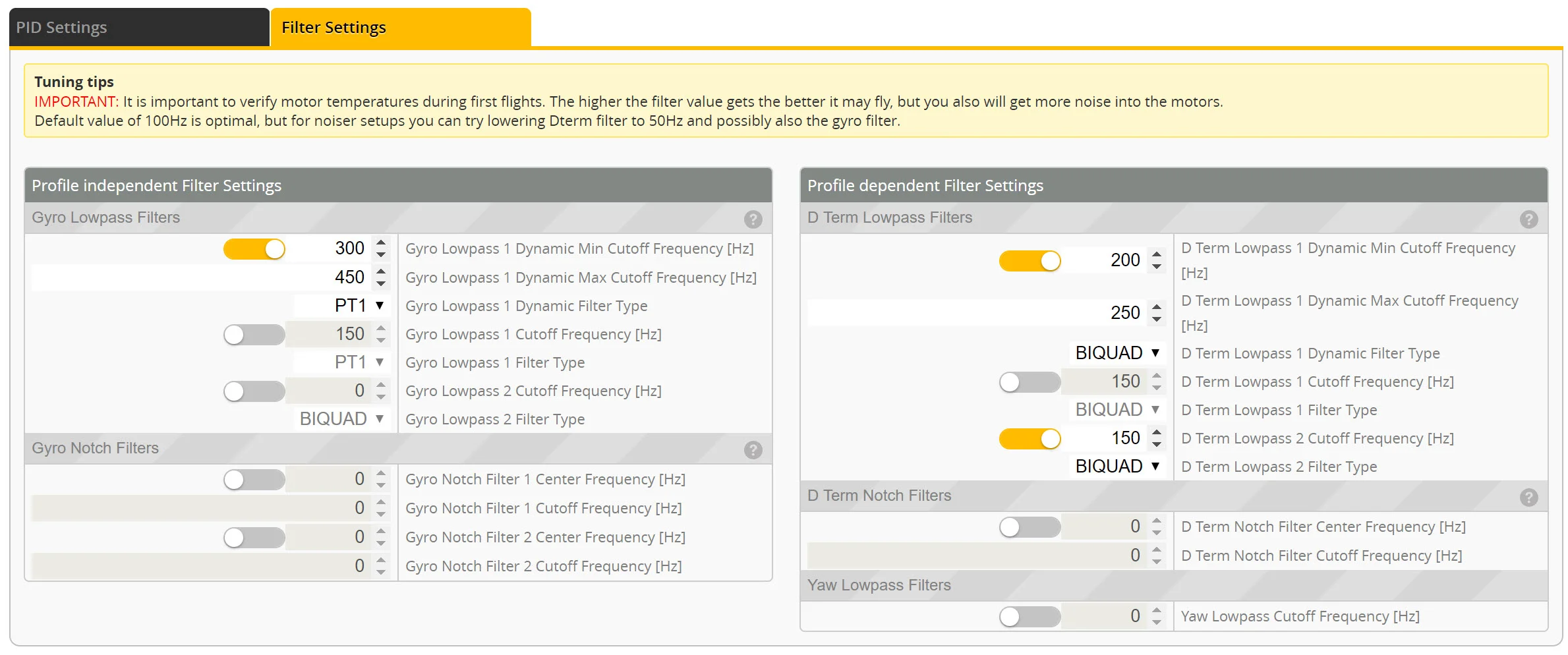 FILTERS: These filters are basically the “I had a quad running great in 3.5.7 and 4.0 isn’t helping” settings. Expect some changes here as I continue to test as 4.0.x improves.